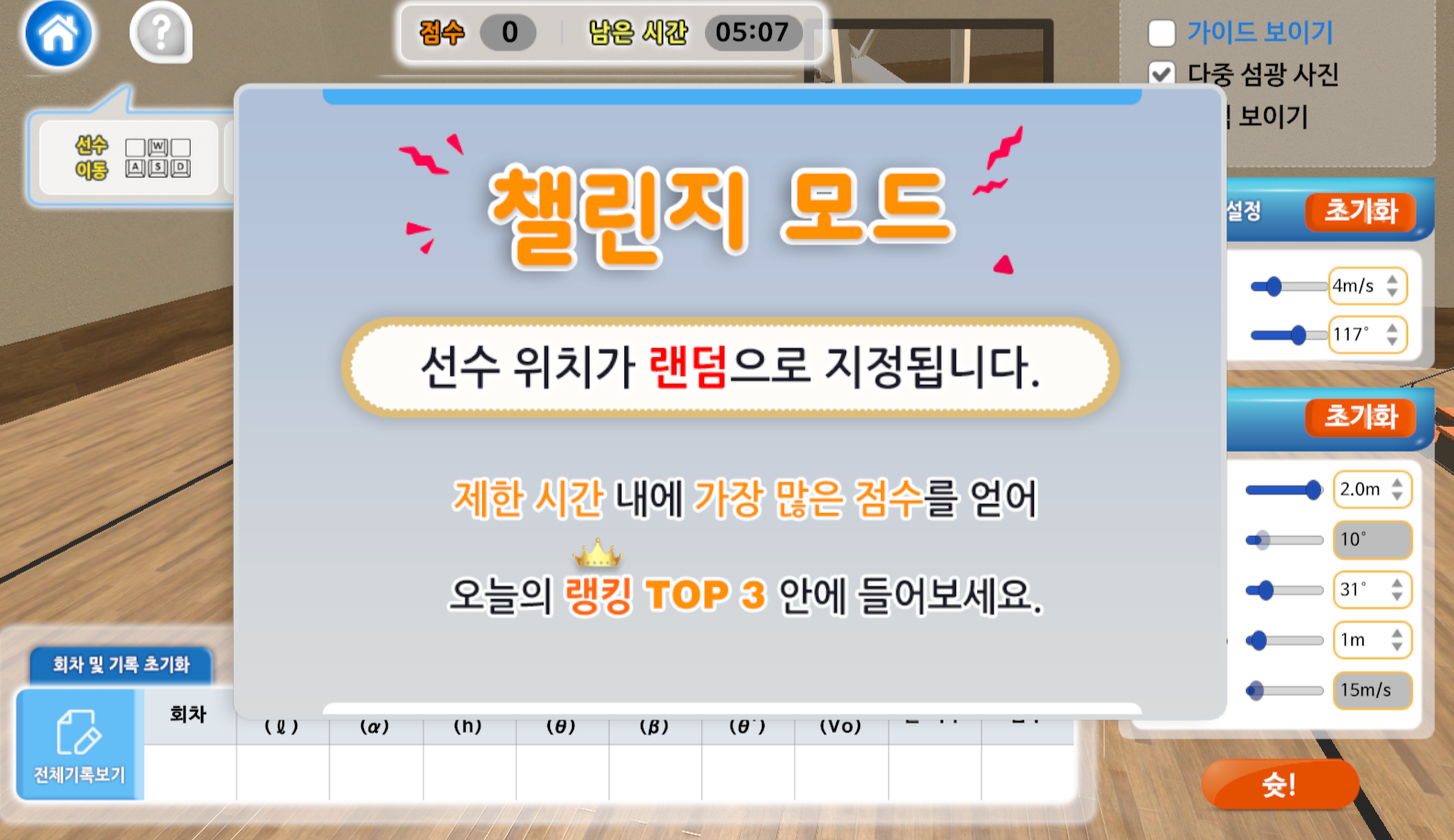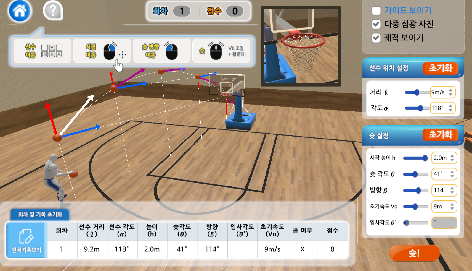1) 플레이어는 코트를 자유로이 이동하며 슛을 쏠 수 있습니다.(키보드와 마우스 자유로이 활용 가능)