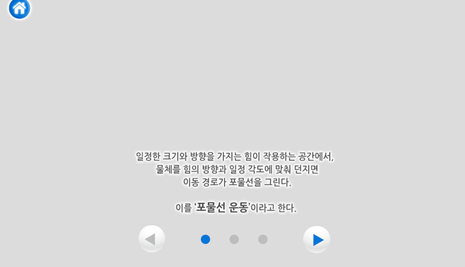 ‘포물선 운동’이란 일정한 크기와 방향을 가지는 힘이 작용하는 공간에서, 물체를 힘의 방향과 일정 각도에 맞춰 던져 나타나는 이동 경로를 말합니다.