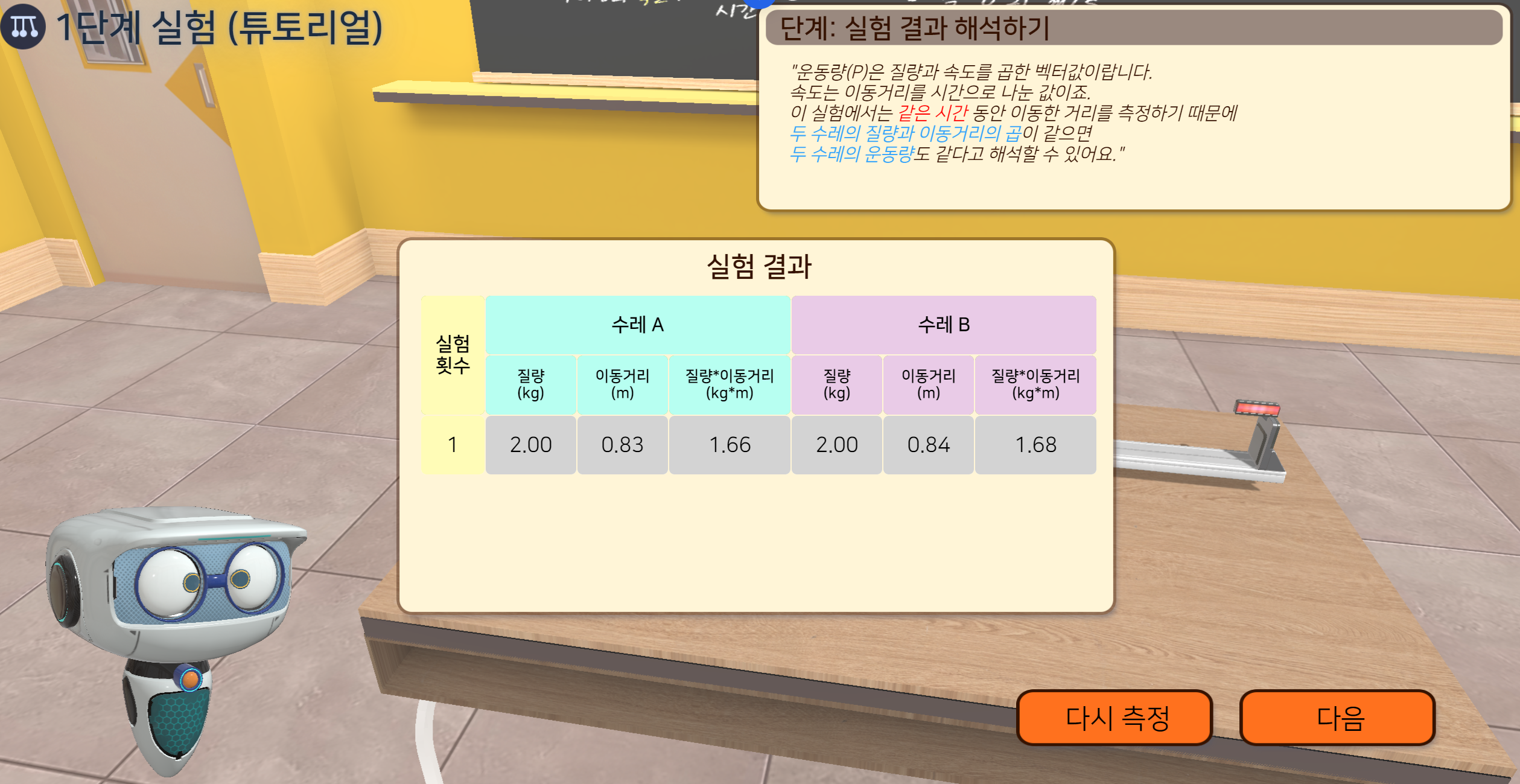 운동량 보존 실험은 교육과정에서 다루는 내용을 가상실험실에서 구현한 것으로 실제 실험기구를 이용하여 직접 실험하는 것과 같이 3D로 만들었습니다. 가상실험실에서 학습자는 수레의 질량과 분리 위치를 변경하여 두 수레가 동시에 막대에 도달하는 경우를 찾고, 이때 두 수레의 이동 거리를 가상의 자를 이용하여 측정할 수 있습니다. 운동량은 질량과 속도의 곱으로 나타낼 수 있음을 이해하고 운동량이 보존되는 과정을 학습할 수 있습니다. 안내자 라비(Lavi)가 알려주는 대로 잘 따라오면 훌륭한 실험 결과를 얻을 수 있답니다. 이론을 이해하기 위해 링크된 유튜브를 통해 사전 학습을 하고 오면 더욱 좋습니다. 운동량 보존 실험실에서는 정지 상태에서 결합된 두 수레가 분리될 때 두 수레의 운동량의 합이 얼마인지 확인할 수 있습니다. 먼저, 학습자가 직접 두 수레의 질량을 선택한 후 동일 시간 이동한 거리를 이용하여 두 수레의 속력을 파악합니다. 그 후, 각각의 운동량을 계산해보고 두 수레의 운동량의 합을 확인해 봅니다. ◆ 운동량 보존 실험의 목적 ● 외력이 가해지지 않는 경우, 계의 운동량이 보존된다는 것은 물리의 기본 법칙 중 하나임을 알 수 있습니다. ● 결합된 두 물체가 분리될 때 분리 전과 후 두 물체의 운동량의 합이 변하지 않는다는 것을, 두 물체의 질량을 다양하게 변화시키면서 학습할 수 있습니다. ◆ 실험 방법 ● 막대와 클램프를 선택하여 책상 가장자리에 클램프로 막대를 고정합니다. ● 수레 2개를 선택하여 결합시키고 수레에 추를 올려놓아 수레 전체의 질량을 변화시킵니다. ● 고무망치로 결합장치를 가격하여 두 수레를 분리합니다. ● 분리된 두 수레가 동시에 막대로 도달하는 출발점 위치를 찾고, 두 수레의 이동거리를 측정합니다. ● 두 수레의 질량과 이동 거리를 곱한 값을 비교합니다.