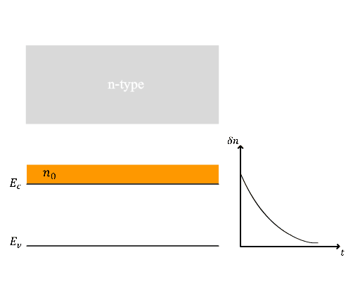 Consider an infinitely large, homogeneous n-type semiconductor with zero applied electric field. Assume that at time t=0, a uniform concentration of excess carriers exists in the crystal, but assume that g'=0 for t>0. If we assume that the concentration of excess carriers is much smaller than the thermal-equilibrium electron concentration, then the low injection condition applies. Calculate the excess carrier concentration as a function of time for $t\ge 0$